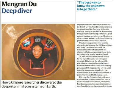 此外,中國科學院深海所地球科學家杜夢然則以深海探索刷新人類認知,她搭乘“奮斗者號”深潛器深入千島——堪察加海溝9000公尺處,首次發現依靠海底甲烷生存的未知生態系統,為深海化能合成理論提供關鍵實證。(校對/趙月)