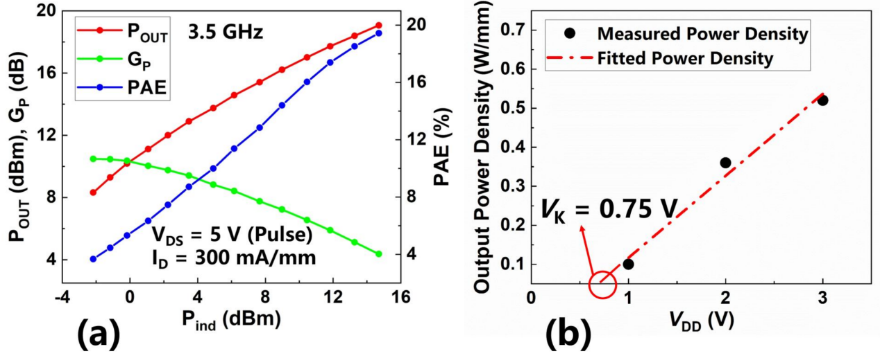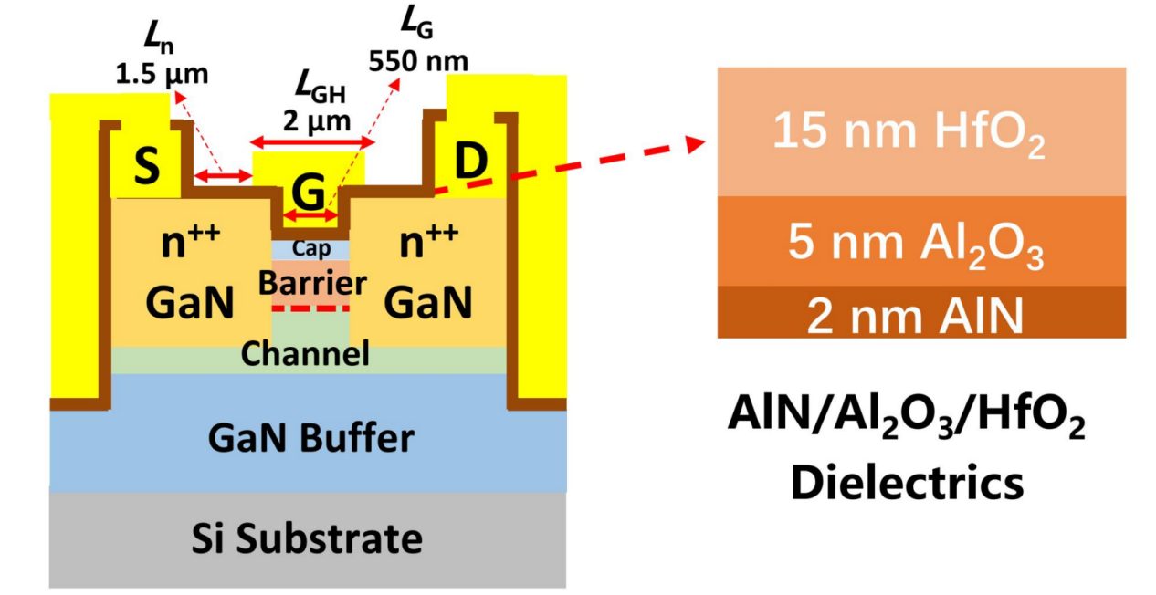 近年來,5G通信應用向手機等移動終端場景深度拓展,對低壓高性能射頻功率放大器(PA)的需求日益迫切。氮化鎵(GaN)高電子遷移率晶體管(HEMT)因其高電子飽和速率和優異的二維電子氣(2DEG)輸運特性,已成為實現高性能射頻前端的理想選擇。然而,常規GaN器件存在較高的膝點電壓,嚴重制約了其在低壓條件下的射頻輸出性能。針對這一問題,國際上的常規做法是采用強極化異質結(如InAlN/GaN、AlN/GaN等)以及“深度縮放”工藝路線,對加工精度要求較高。