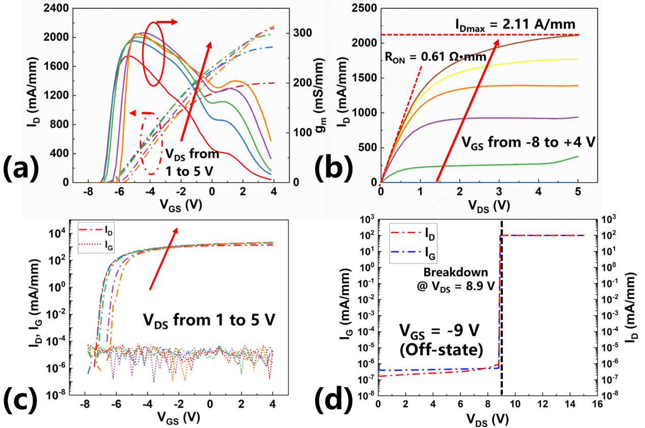 研究團隊通過將源漏極歐姆接觸區域延伸至柵極邊緣,并采用n??-GaN二次外延技術,有效抑制了常規器件中由非柵控2DEG區域引入的接入區電阻,進而顯著提升了器件的輸出特性。該器件在550 nm柵長下,實現了2.11 A/mm的飽和電流密度、300 mS/mm的峰值跨導以及0.61 Ω·mm的低導通電阻,歐姆接觸電阻低至0.09 Ω·mm。